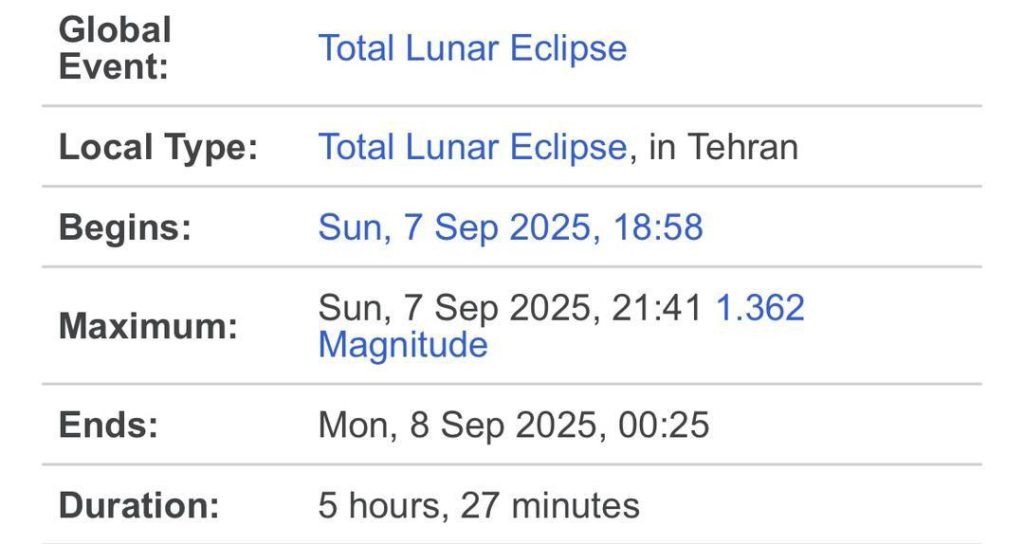 يكشنبه ١٦ شهريور ١٤٠٤ یکی از طولاني ترين ماه گرفتگی قرن در بعضی شهرهاي ايران از جمله تهران رخ می دهد. اين ماه گرفتگی حدودا ٥ ساعت طول می كشد .